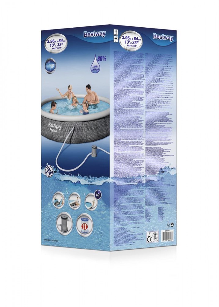 Ezzel a Bestway® összeszerelhető medencekészlettel pillanatok alatt készen áll az udvari beach, és indulhat a nap a medencében! Nagyon egyszerű - keressen egy sima felületet, fújja fel a feső gyűrűt, és a medence kitöltésekor kiegyenesedik. A strapabíró medencebélés megerősített 3 rétegű TriTech ™ anyagból áll, rendkívül robusztus, szakadásálló tulajdonságokkal. A külső fal vonzó és valósághű rattan kinézetű nyomtatása stílusát és eleganciáját adja kertjének. A medence készlet tartalmaz egy szűrőszivattyút is hogy a víz mindig kristálytiszta és tiszta maradjon. Amikor a fürdési idény lejárt, a tárolás gyors és egyszerű. A víz a leeresztő szelep segítségével könnyen elvezethető. Ezután könnyedén felhajthatja a medencét, hogy elrakhassa a következő használatig. A Bestway® Fast Set ™ medencéje tökéletes nyarat nyújt Önnek különösebb erőfeszítés nélkül!