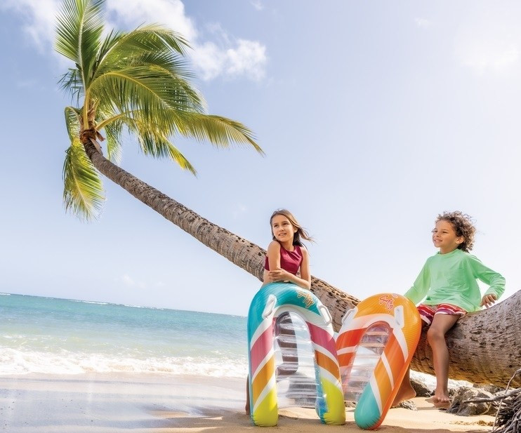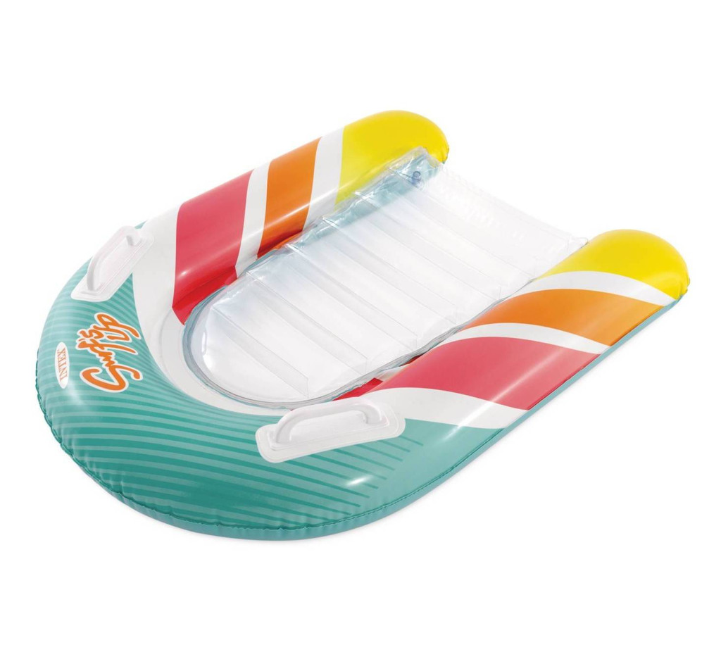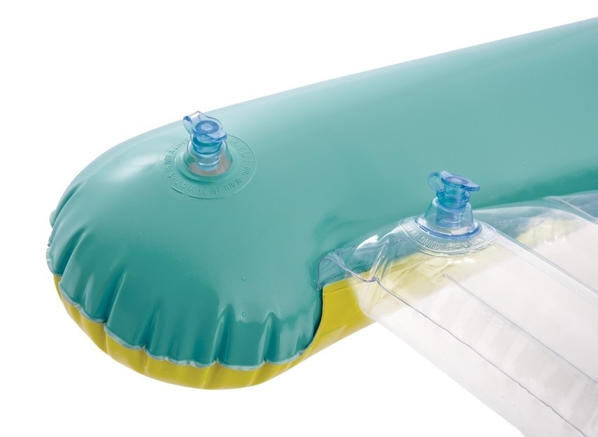 A Surf's Up Rider felfújható szörf matrac két masszív fogantyúval a jobb stabilitás érdekében, és átlátszó középső résszel, így a gyerekek kényelmesen megfigyelhetik a világot maguk alatt.