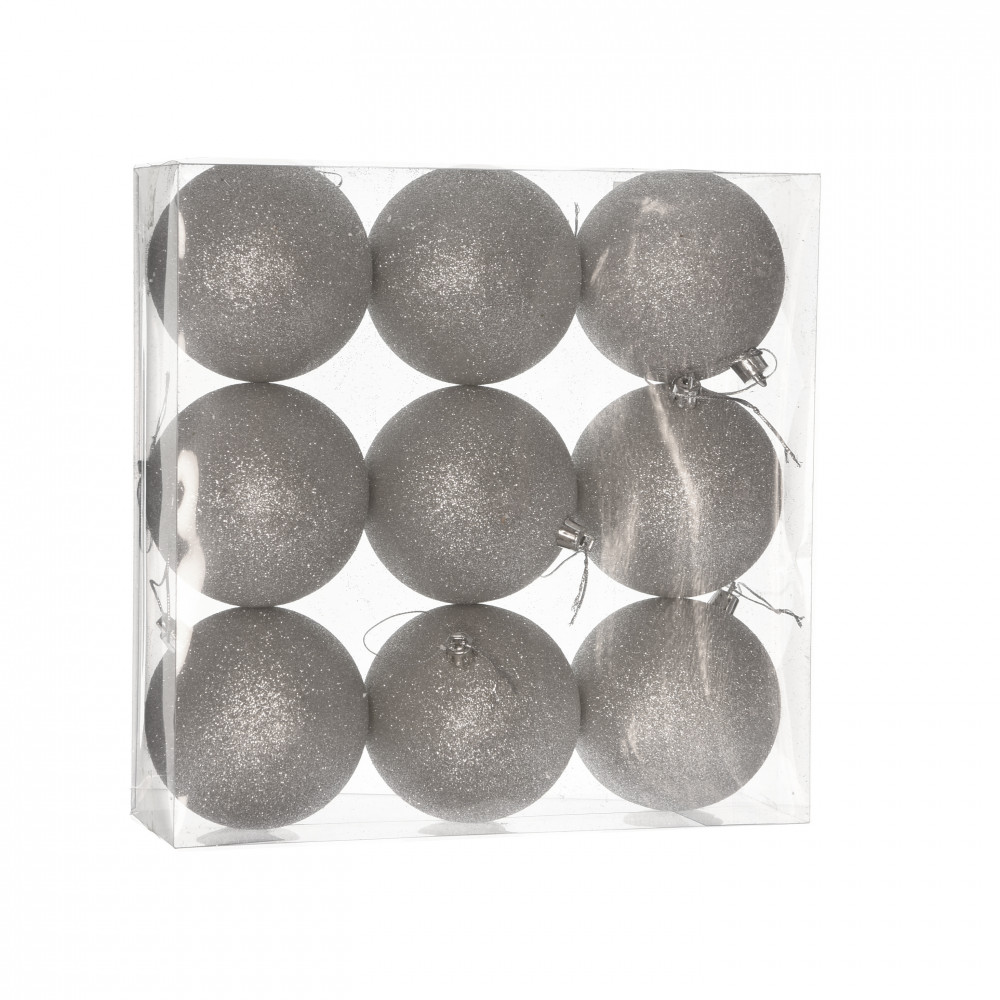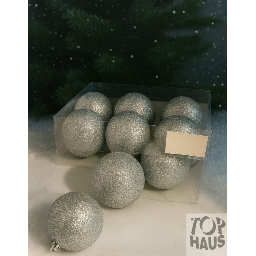 Műanyag gömb dobozban 8 cm ezüst glitteres