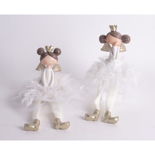 Polcon ülő angyalfigurák bolyhos tollszoknyával, arany csizmával és lógó lábakkal.