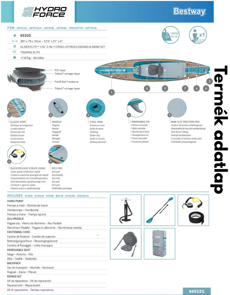 Az állítható 217 cm (85 hüvelyk) méretű evező átalakítható kétlapátos változattá