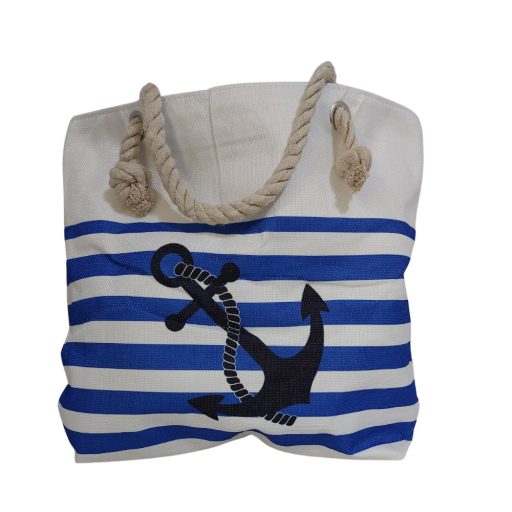 Divatos női nagy méretű strand kézitáska. Széles csíkos-horgonyos mintával. A táska szövet anyagból készült, mely zipzárral záródik.