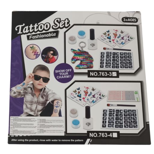 Gyermek tetováló szett. A sablonok segítenek a könnyű grafikák elkészítésében.
